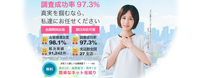 電話・メール・WEBフォームでの無料相談に対応。相談時の説明が丁寧で分かりやすいという声も多く、初めて探偵に依頼する方でも比較的ハードルが低い探偵社です。